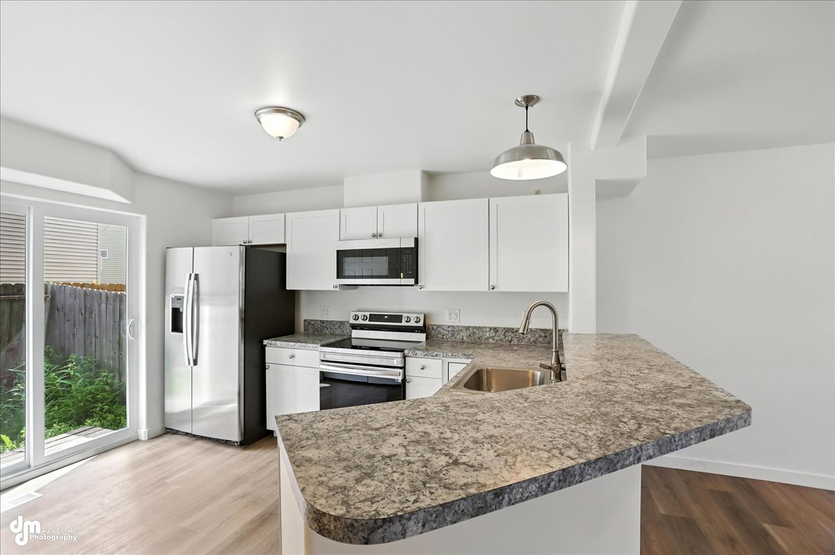 Pets Allowed. New laminate floors and new carpet. Well maintained bottom floor unit = no stairs! Living area opens to back deck. Washer and dryer in the unit! Close to military bases, schools and Tikahtnu shopping center. HOA includes: water/sewer, trash, snow removal, insurance, exterior maintenance and grounds maintenance. Designated parking spot out the front door and straight down the walkway